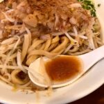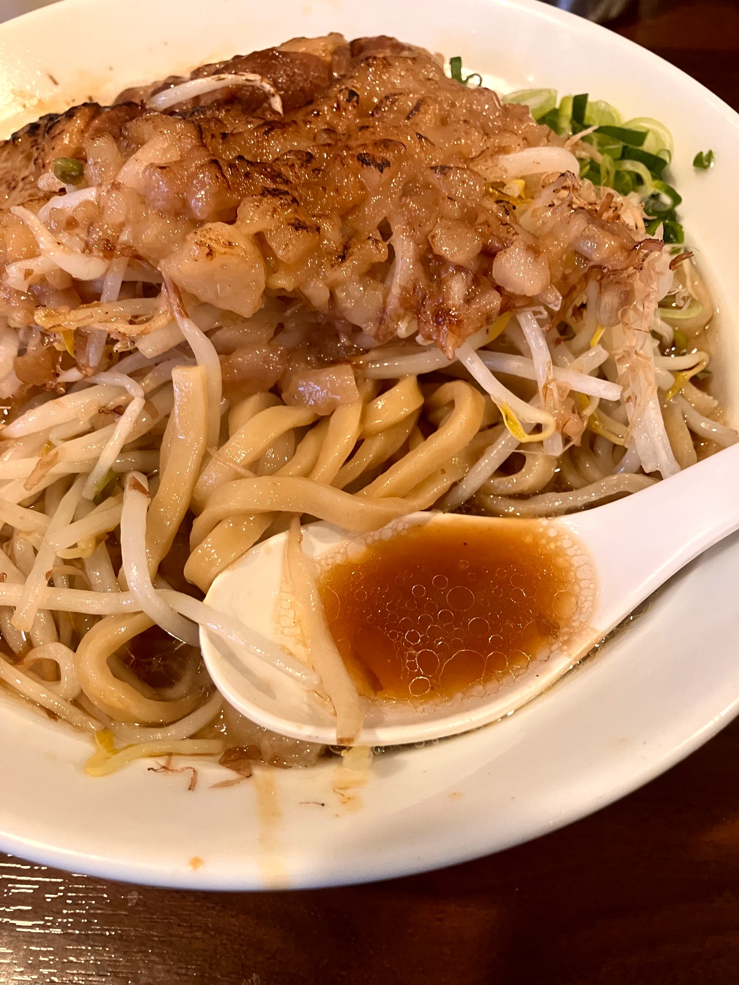 トッピングでニンニク頼むとニンニク辛さにスープが支配されてしまいそうな感はあるシャキッとしてるモヤシとスープの相性はそこそこだと思うのであまり増さない事を勧めたい。別卓で用意されてる鰹節掛けるのは結構オススメ😍
