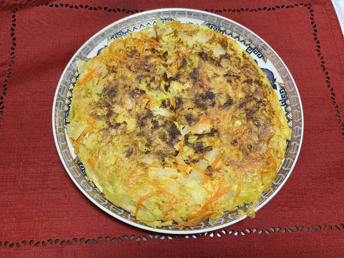 キャベツと玉ねぎと人参を混ぜて焼きました。お好み焼きに似ているけれども、お好み焼きと同じくとても健康的な簡単料理です。