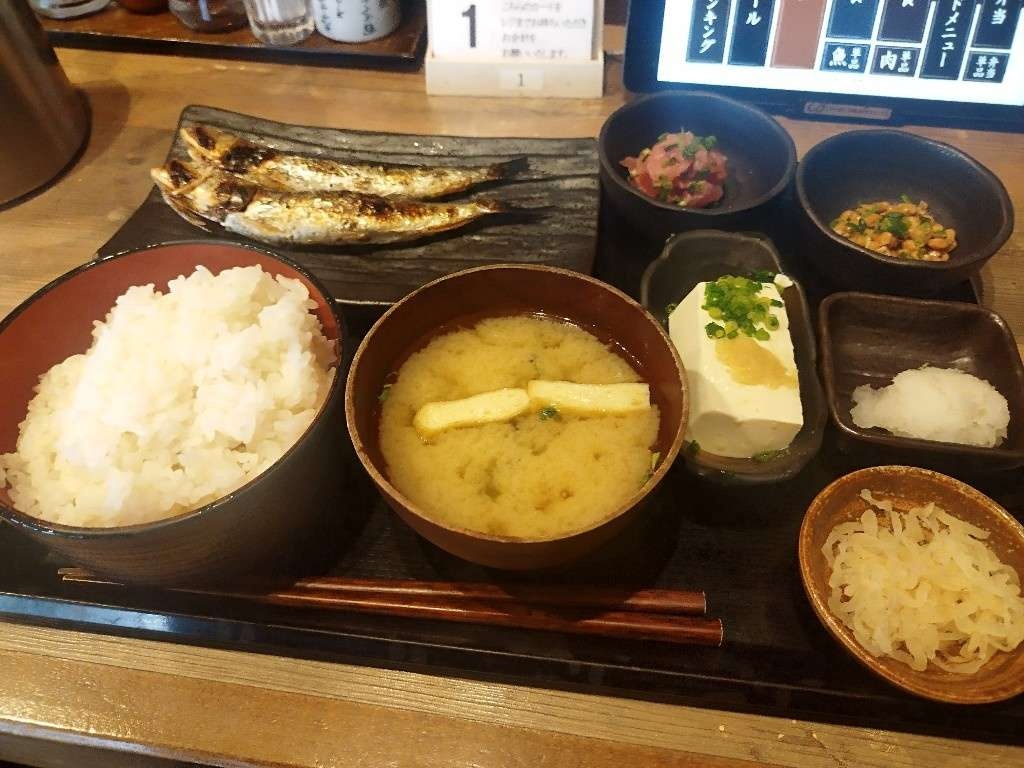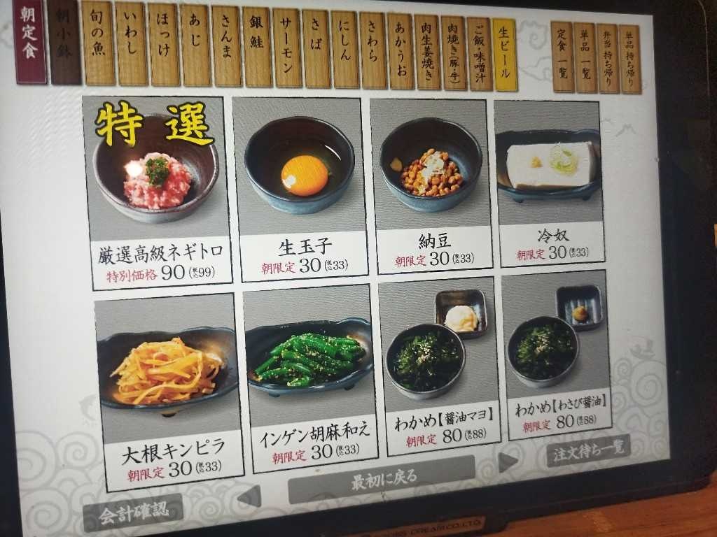 - んで、朝メニューから朝イワス定食を♬小鉢の追加はネギトロと納豆と奴だわさ