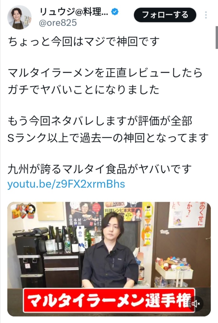 料理研究家リュウジ、ついに禁断の「マルタイ棒ラーメン」をレビュー。