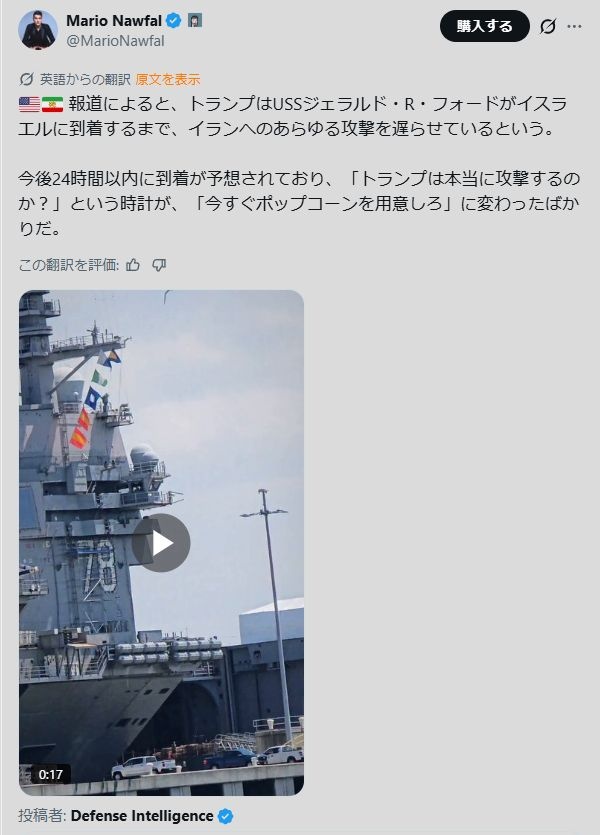 「第三次世界大戦前夜だと思っている」トランプ大統領の暴走は止まらない…アメリカとイランの対立、国際政治学者が緊迫の情勢を緊急解説(ABEMA TIMES) - Yahoo!ニューストランプ大統領が暴走だとすると止められる人間はいるのか。その問いに国際政治学者の舛添要一氏は「いない」と即答した。 19日、トランプ氏は「合意に至らなければ不幸な結果となるだろう。10日から1news.yahoo.co.jphttps://x.com/MarioNawfal/status/2025531010897609175x.com - 4 : 2026/02/22(日) 20:45:08.77 ID:gdxE9+zW0