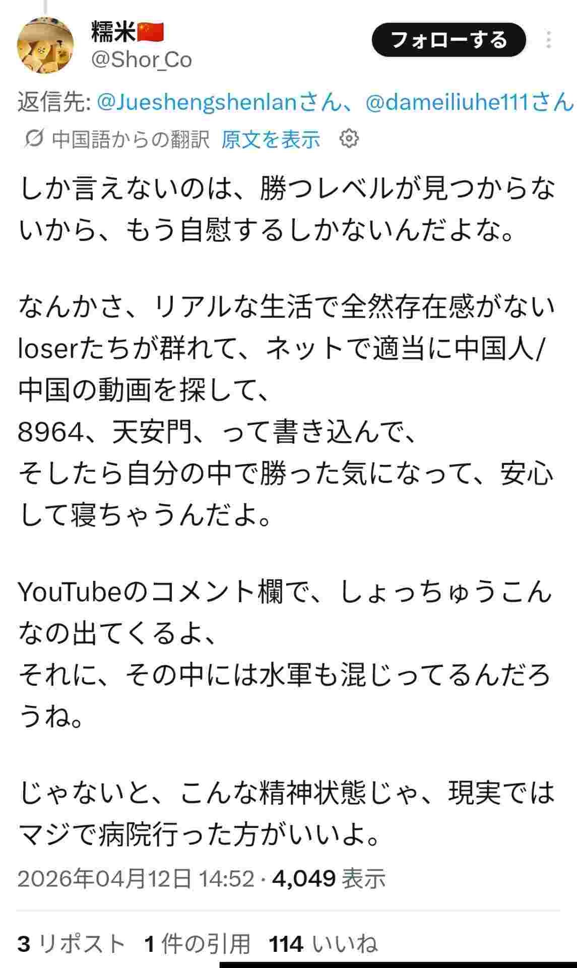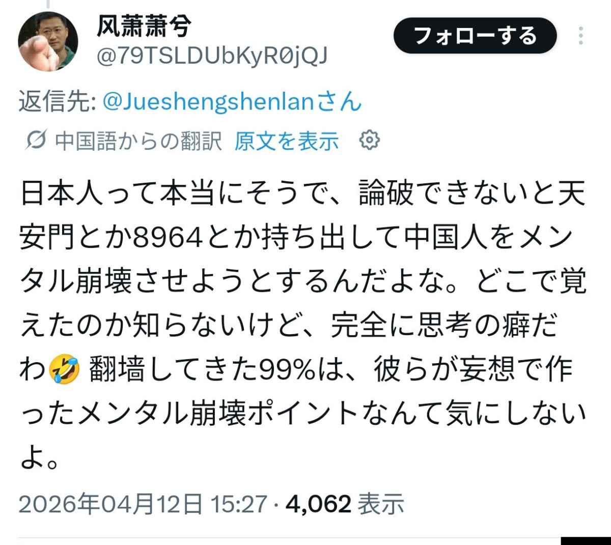 「六四天安門」などの糖質日本人のおまじない、AI翻訳で中国人に見つかり馬鹿にされるwww