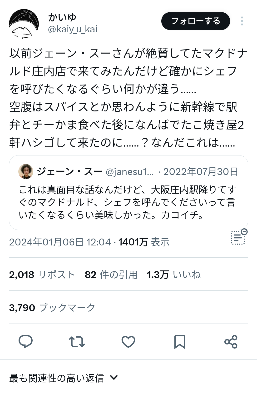 「庄内駅出たところのマクドがクソ美味い」真偽不明の情報がXで出回る「明らかにレベルが違う」
