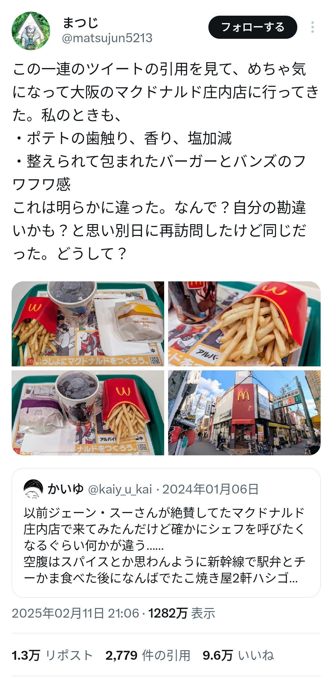 マクドナルドってのはどこで食っても同じ味っていうコンセプトで成りあがってきたビジネスモデルなのに - 137 : 2025/02/12(水) 10:06:14.68 ID:IU23EUsS0
