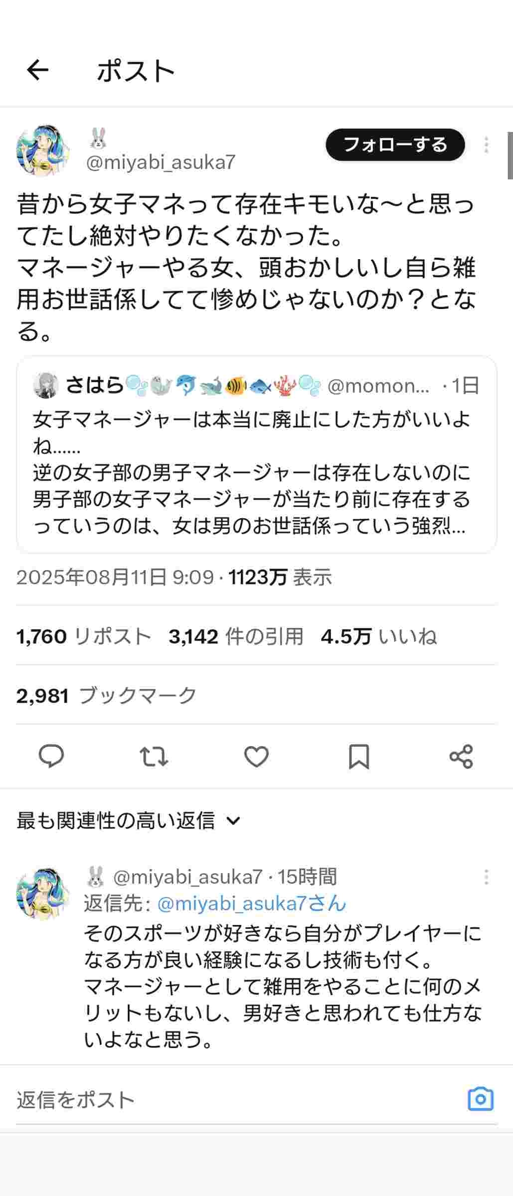 「男子運動部での女子マネージャーの存在はジェンダー論では押し付けになるが本人が望んでやってるんだから素晴らしい」