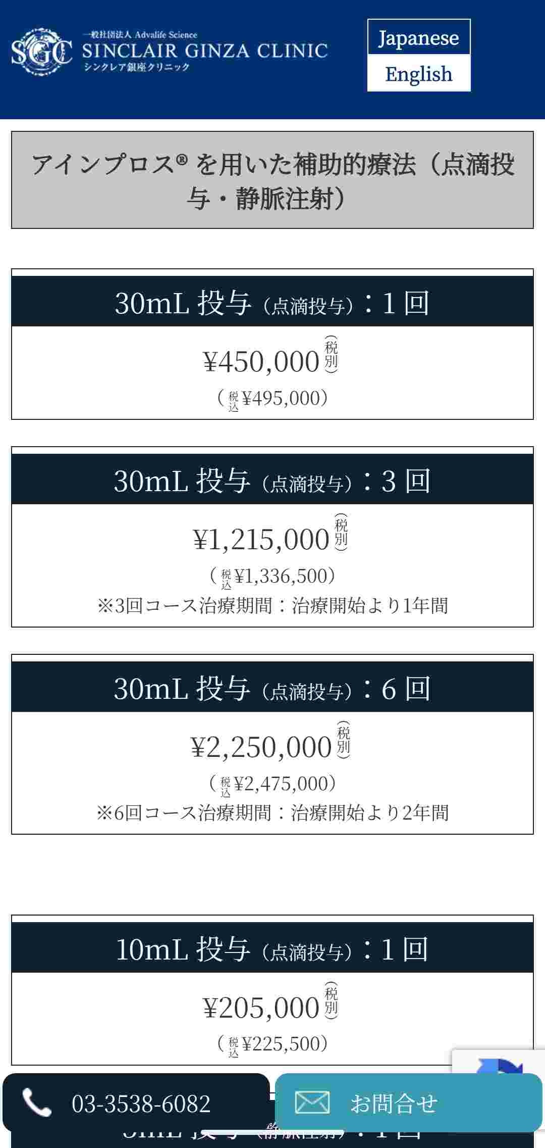 ※「アインプロス点滴療法」は、医療機関・医師の責任の下で医療行為として施術を行うことが求められており、「アインプロス」自体は、薬機法上の承認を得た 医薬品ではありません。