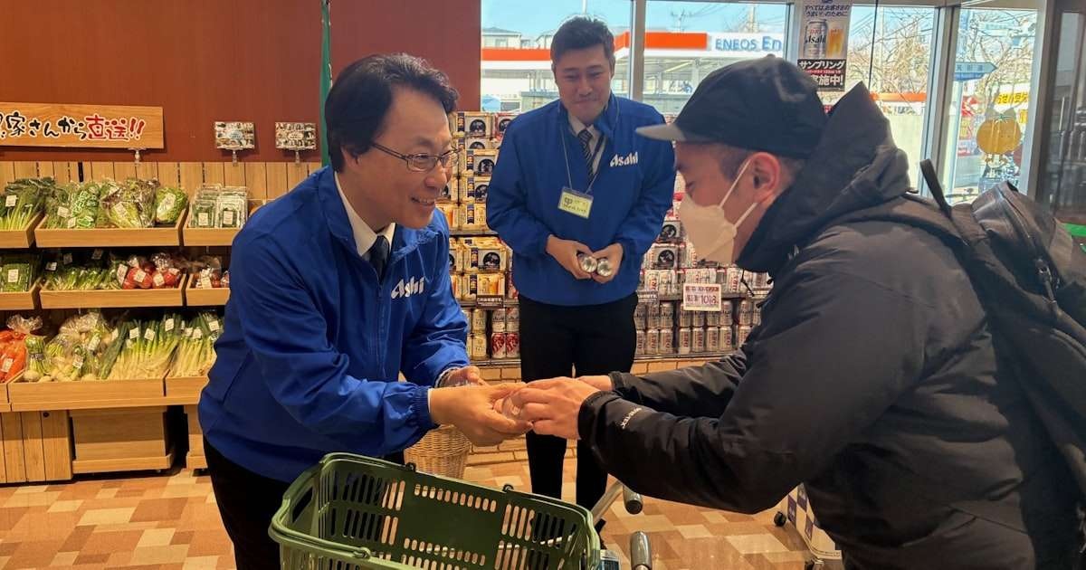 「スーパードライ缶135ml御礼デザイン缶」の配布は2日に始めた。缶の裏側には消費者などに向けた感謝のメッセージをあしらった。10日に都内のスーパーでの無料配布イベントに参加したアサヒの松山一雄社長は「感謝の気持ちを言葉だけでなく行動でお伝えし、より信頼される企業として再始動、反転成長に取り組む」と述べた。
