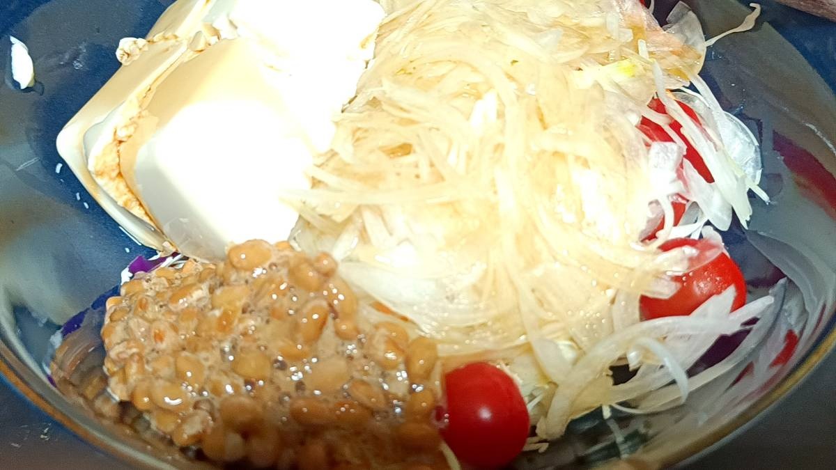 - 豆腐と納豆と玉ねぎ1玉とカットキャベツ1袋や