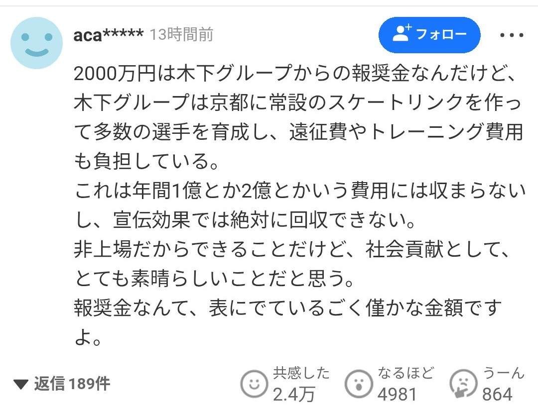 - そんなん言い出したら今までの夏季冬季の歴代金メダリスト全員を一生保証しないとあかんくなるじゃん😅