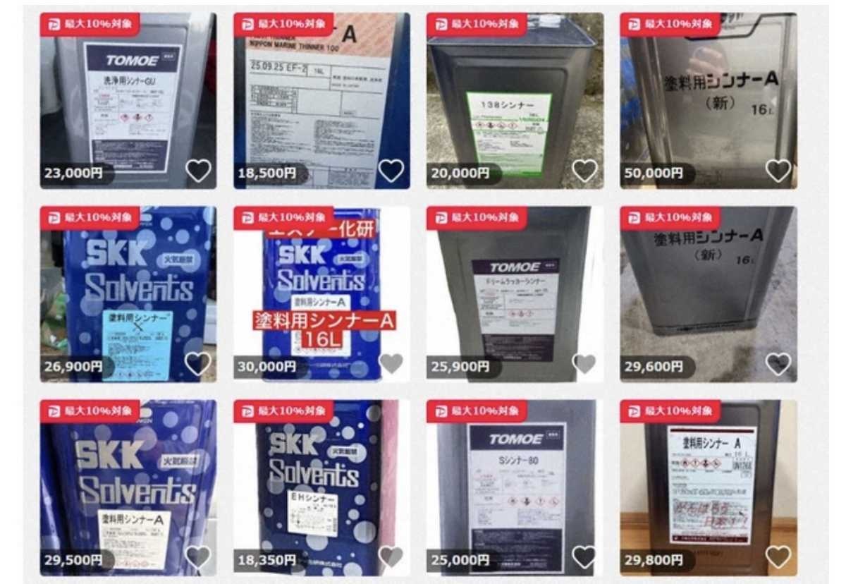 大手フリマサイトやオークションサイトをのぞくと、1万円以上で出品された各社の塗料用シンナーなどの一斗缶がずらりと並ぶ。