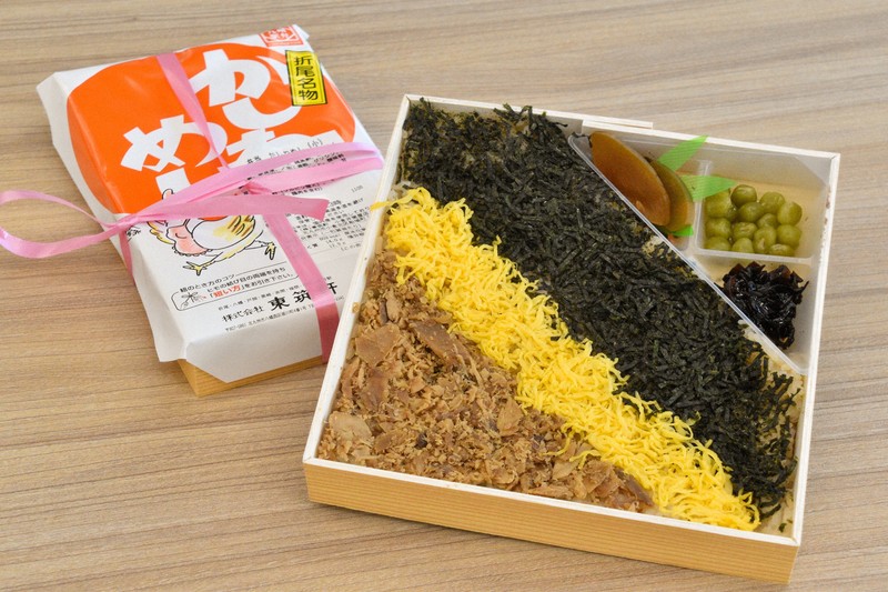 かしわめしは、鶏のスープの炊き込みご飯の上に、しょうゆなどで煮詰めて香ばしく仕上げた鶏肉、錦糸卵、刻みのりを並べた弁当。