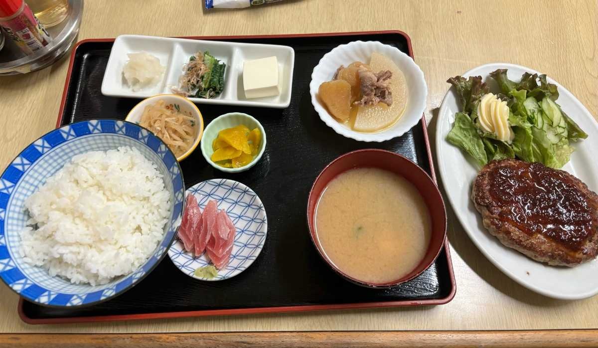 定食屋ならトレーは朝定で400円このサイズのハンバーグ付いて700円ぐらいか