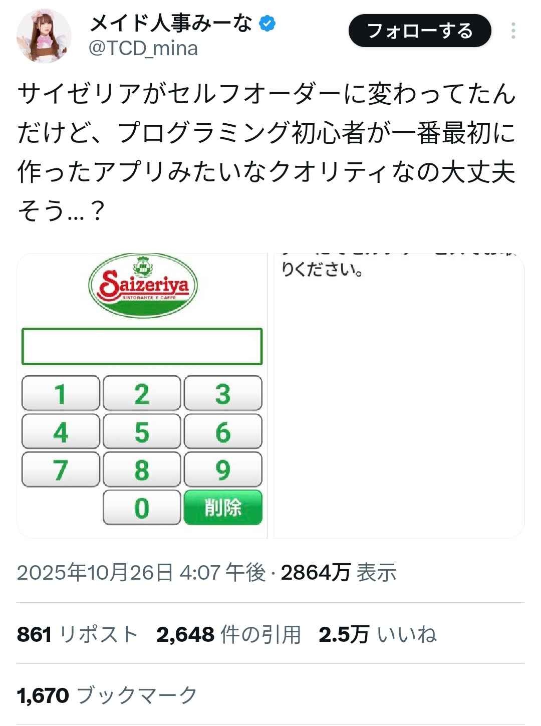 【画像】サイゼリヤのセルフオーダー、プログラミング初心者が作った感じで炎上