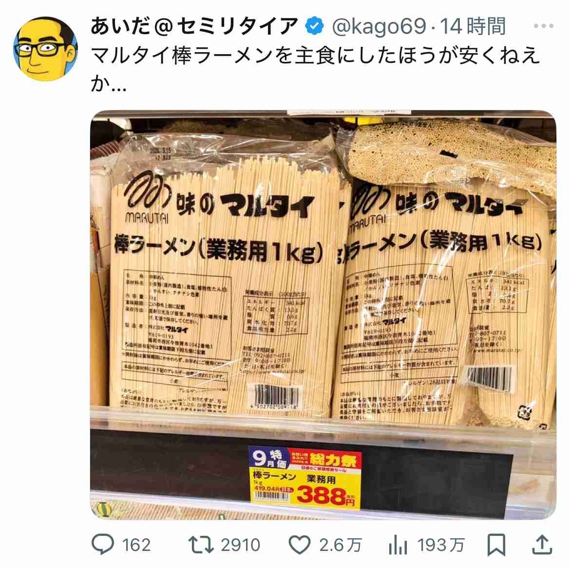 マルタイじゃなくて播州製麺のちょっと太いやつが置いてあるとこもあるけど - 47 : 2025/10/09(木) 14:46:47.146 ID:Oh/rrV1l5