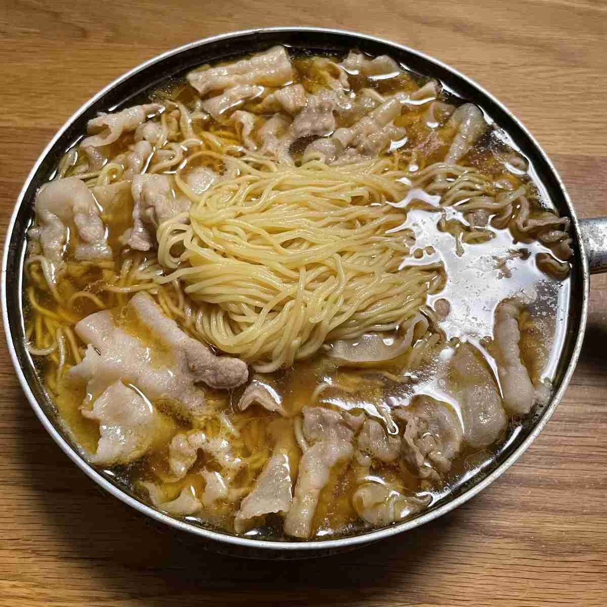 - 袋麺と豚肉大量に入れて茹でてたれ入れるだけ?