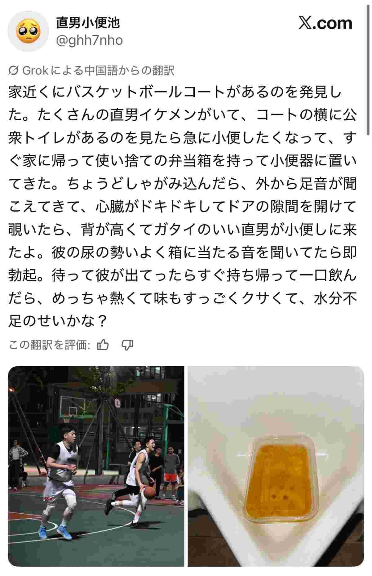 【画像】中国人ゲイ「近所のバスケコートにノンケのイケメンが沢山いたから家から弁当箱持ってきて小便器に置いた」➡結果…