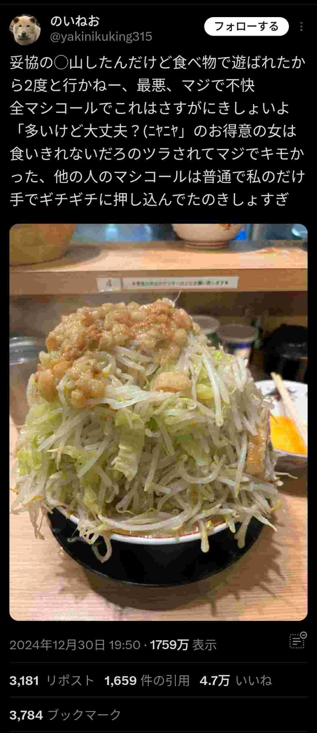 【画像】二郎系店員「ニンニクいっちゃってみたりしちゃいます?」女性客「んーと…倍野菜で!」結果…