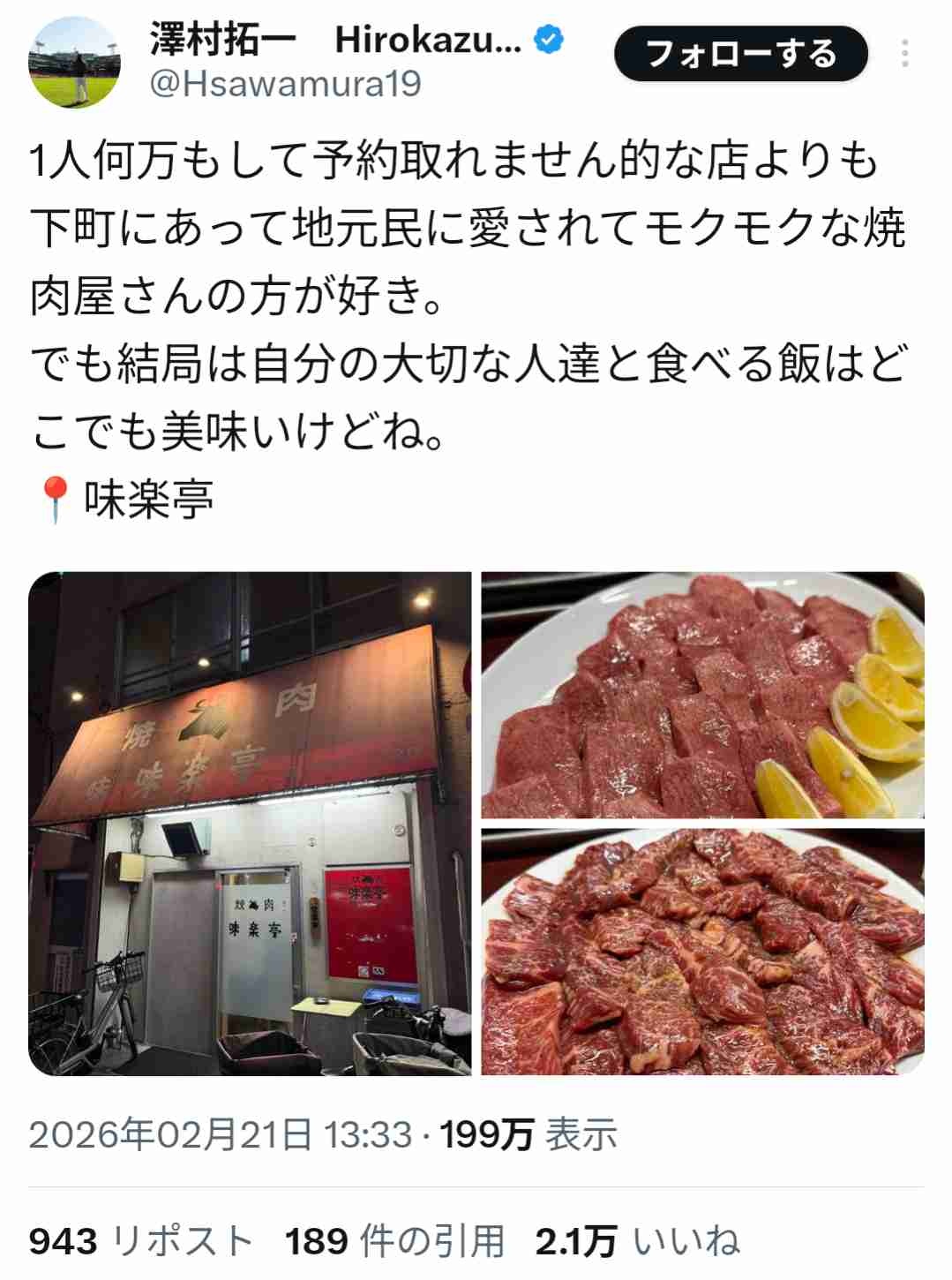 【画像】元プロ野球選手の澤村拓一さん、「一人何万もして予約の取れない店なんかよりも…」と高級焼き肉を貶して大炎上