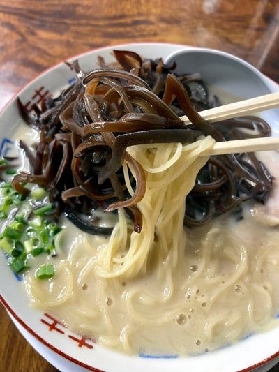 【画像】豚骨ラーメンにしか見たことない、黒い謎のコリコリしたヒゲみたいな食材の正体www何?