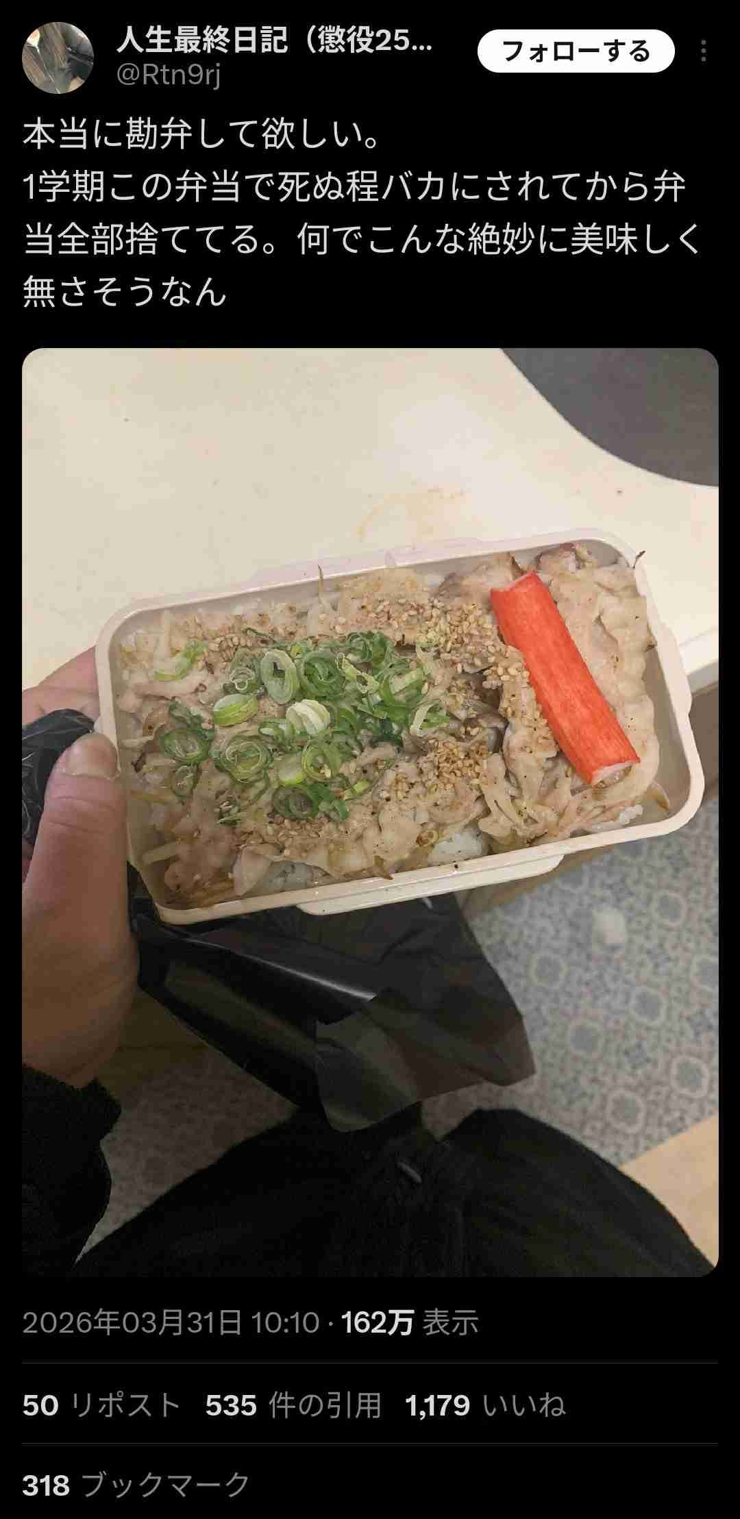 冷凍食品詰め合わせ弁当の方が断然良いわ - 12 : 2026/03/31(火) 17:10:51.07 ID:Uq7vMCh7M