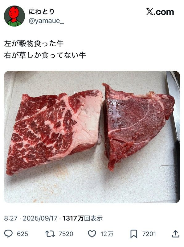 【画像】Xメン「左が穀物食った牛、右が草しか食ってない牛」12万いいね これマジ?