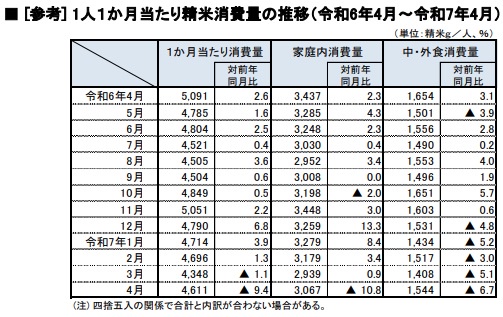 1人1ヵ月当たりの消費量は4611グラムで前年同月比▲9.4%。そのうち家庭内消費量は3067グラムで同