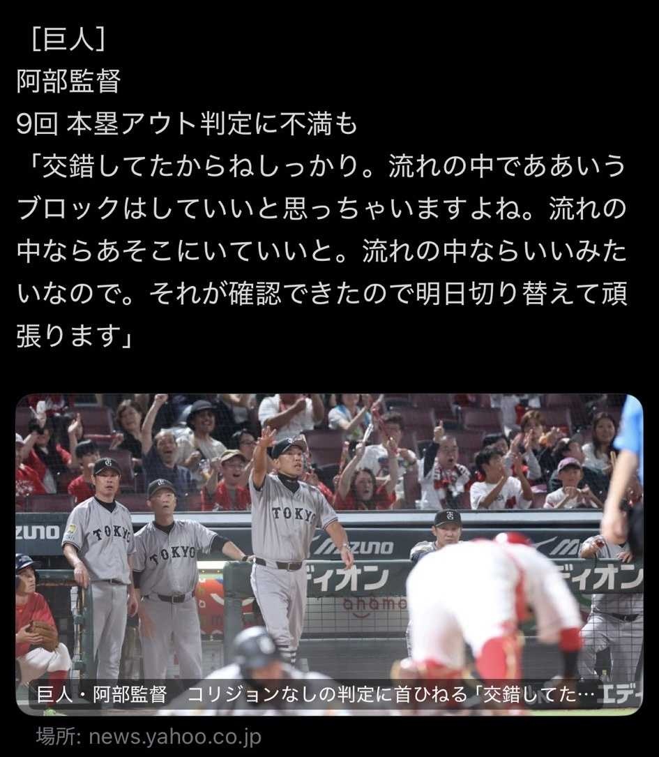 阿部の勘違いを受け入れて流れの中とか意味わからん説明した審判が一番悪いだから>>2の明らかな捕手側のコリジョン違反にランナーアウトしなきゃならなくなった