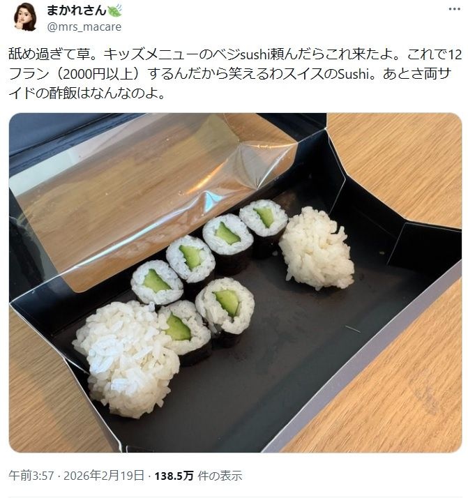 キッズメニューのベジsushi頼んだらこれ来たよ。これで12フラン(2000円以上) - 2 : 2026/02/19(木) 18:52:45.17 ID:JXFdxp1Z0