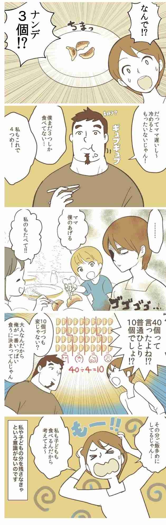 おぱーいママ「餃子たっぷり40個も焼いたよ~」 チビ「わぁ~い👶」 夫「40個食っちゃおw」