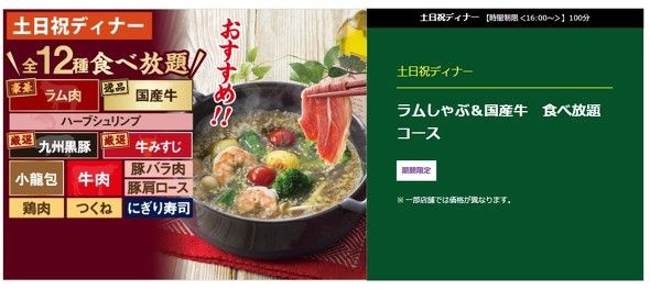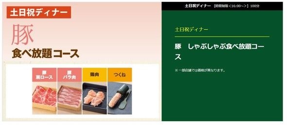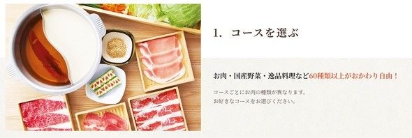 業界1位、2位の両チェーンは似ているようで違いが大きい。まずはしゃぶしゃぶ温野菜のメニューを見てみよう。基本となるディナーの「温野菜コース」は3828円で、2種類のだしを選べる。肉は牛・豚・鶏から全11種類を提供する。野菜のほか、米や中華麺、うどんなどの炭水化物も食べ放題に含む。