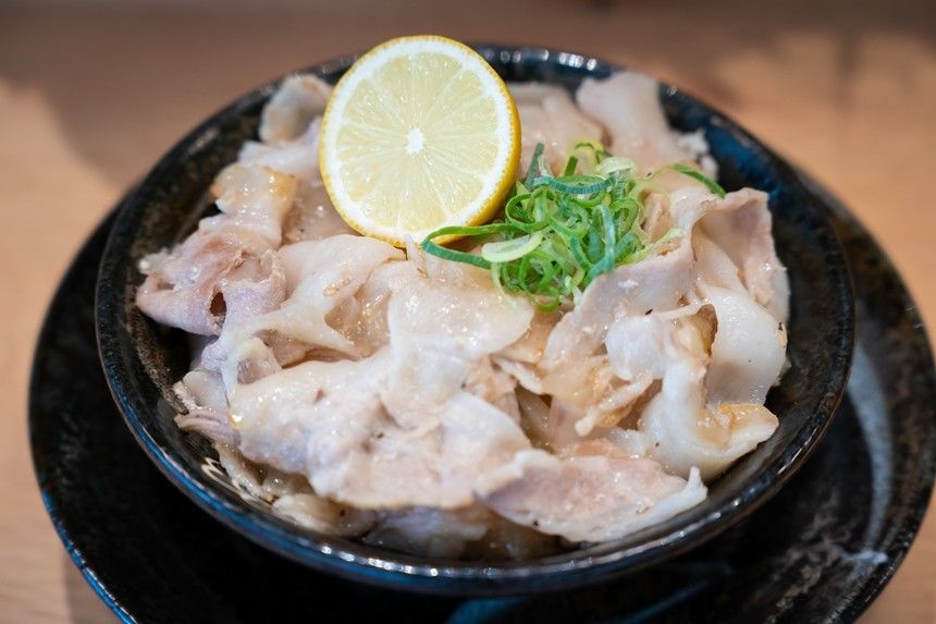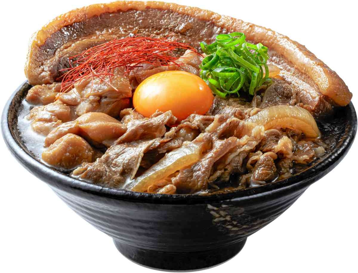 1千円台のメニューは、牛、豚、鶏のうまみを凝縮した「三種の煮込み肉まみれうどん(中:1500円、大:1680円)」や、牛肉ととんかつをぜいたくにトッピングした「あふれ盛り肉カレーうどん(中:1100円、大:1280円)」、塩豚カルビと半割レモンを組み合わせた「焼き塩豚カルビの半割レモンぶっかけ(中:1千円、大:1180円)」など5種類。