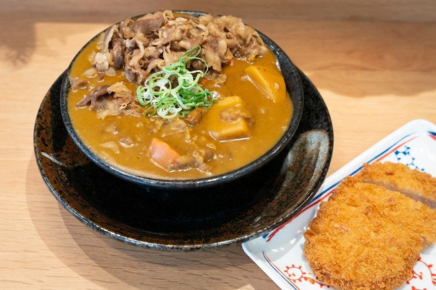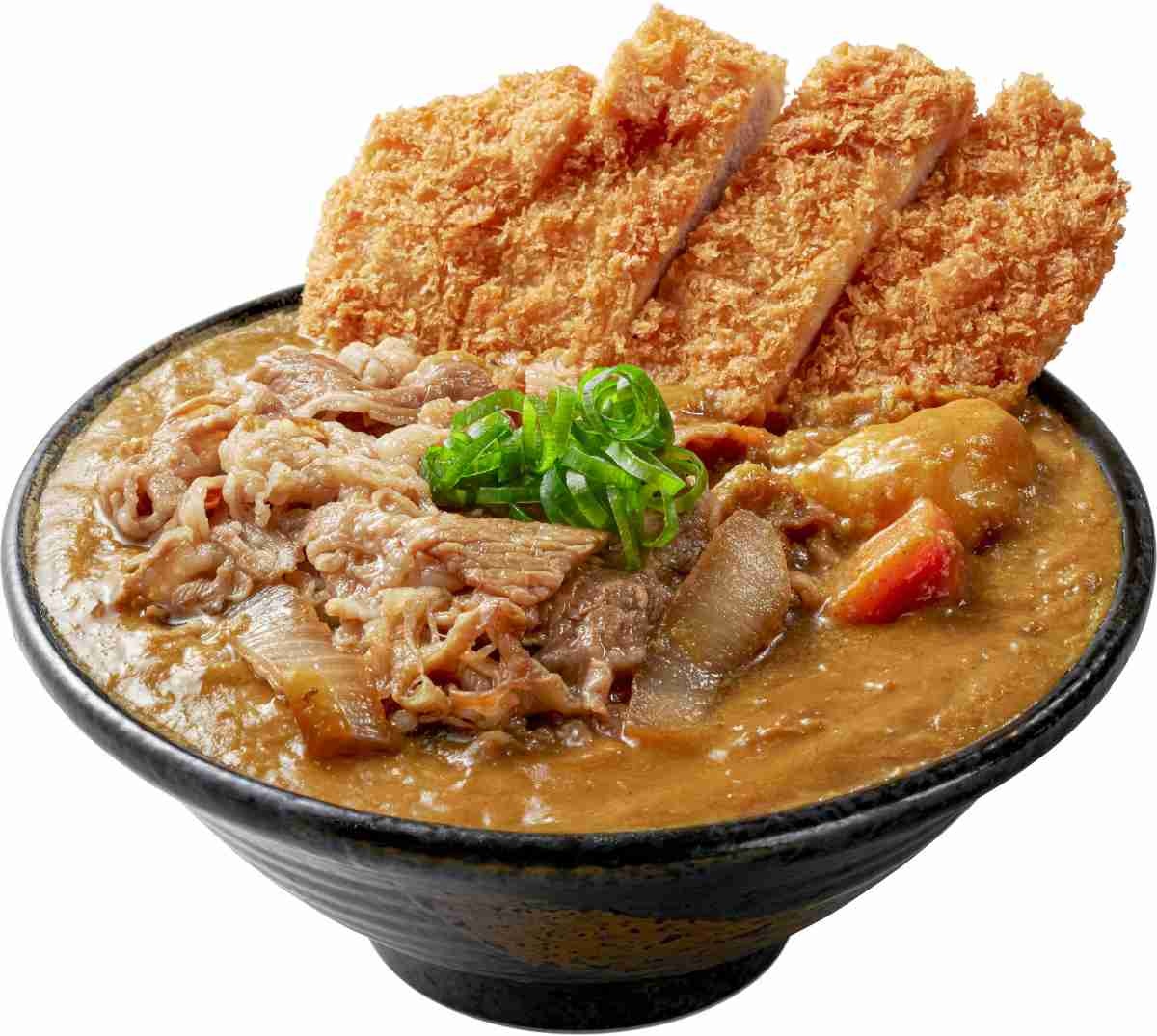牛肉ととんかつをトッピングした「あふれ盛り肉カレーうどん」=はなまる提供