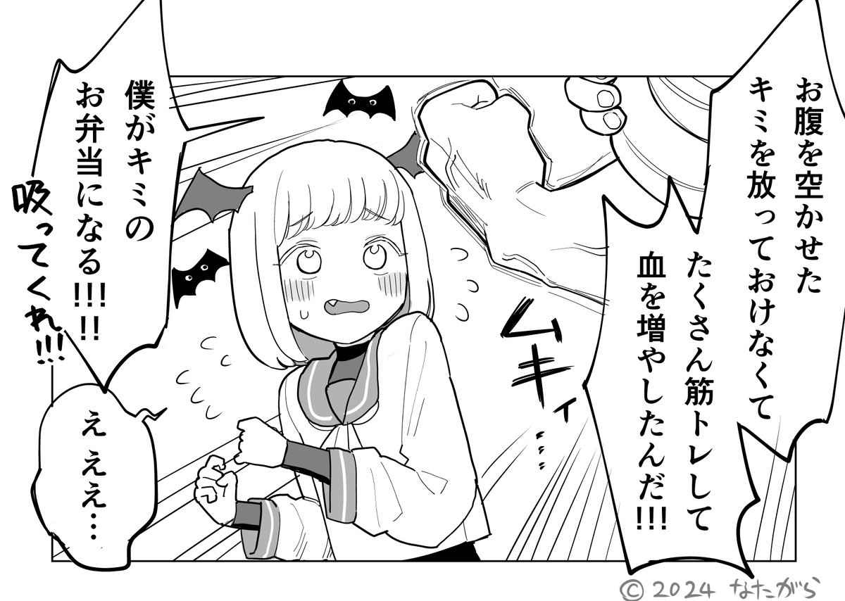 なたがら「吸血鬼のお弁当になりたい」は、吸血鬼の少女・鬼頭ゆきと料理好きな男子・大森弁人が、お昼休みに交流する物語。自分の作った弁当を誰かに食べてもらいたかった弁人は、鬼頭さんがいつもお弁当を持ってきていないと知り、彼女のためにお弁当を作って渡す。しかし鬼頭さんがお弁当を食べないのは、吸血鬼になったことで血以外の食事を受け付けないからだった。吸血鬼用の血液パックが品薄で、節約のためお昼を抜いていると聞いた弁人は、「クラスメイトがずっとお腹をすかせてるなんて放っておけない」「よかったら僕の血吸う……!?」と声をかける。