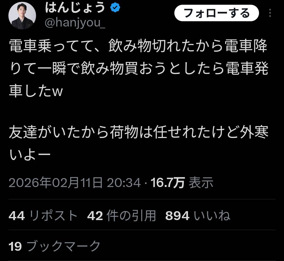 はんじょう「電車で飲み物切れたから電車降りて一瞬で飲み物買おうとしたら電車発車したw 友達に荷物任せたけど外寒いよー」