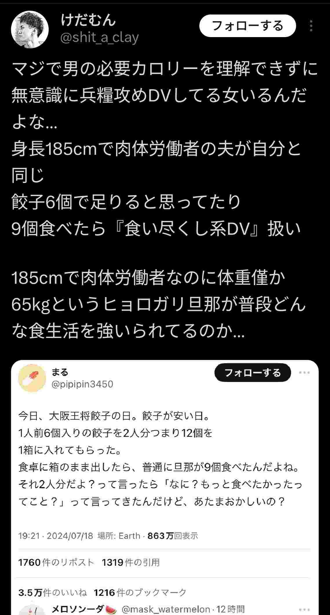 まんさん「餃子12個だしたら夫が黙って9個食べやがった」ちんさん「男が餃子6個で足りるわけないだろ」←これ