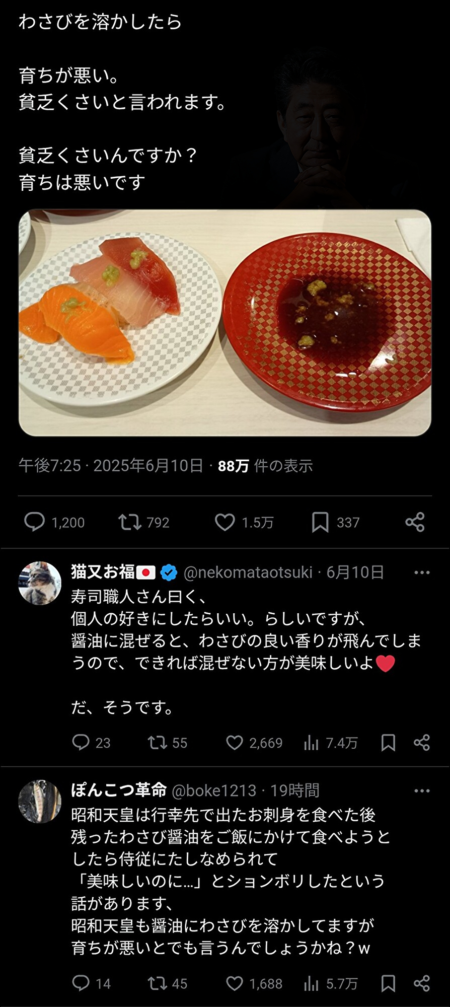 しょうゆにとかさないで直接シャリにわさびだとダイレクトにわさびがきつすぎてまずいんだよ