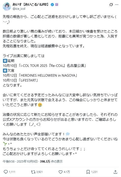 女性アイドルグループ、iLiFE!(あいらいふ)のメンバー、あいす(19)が10日までにX(旧ツイッター)を更新。肝臓や胆のうなどに異常が見つかったとして入院することを報告した。