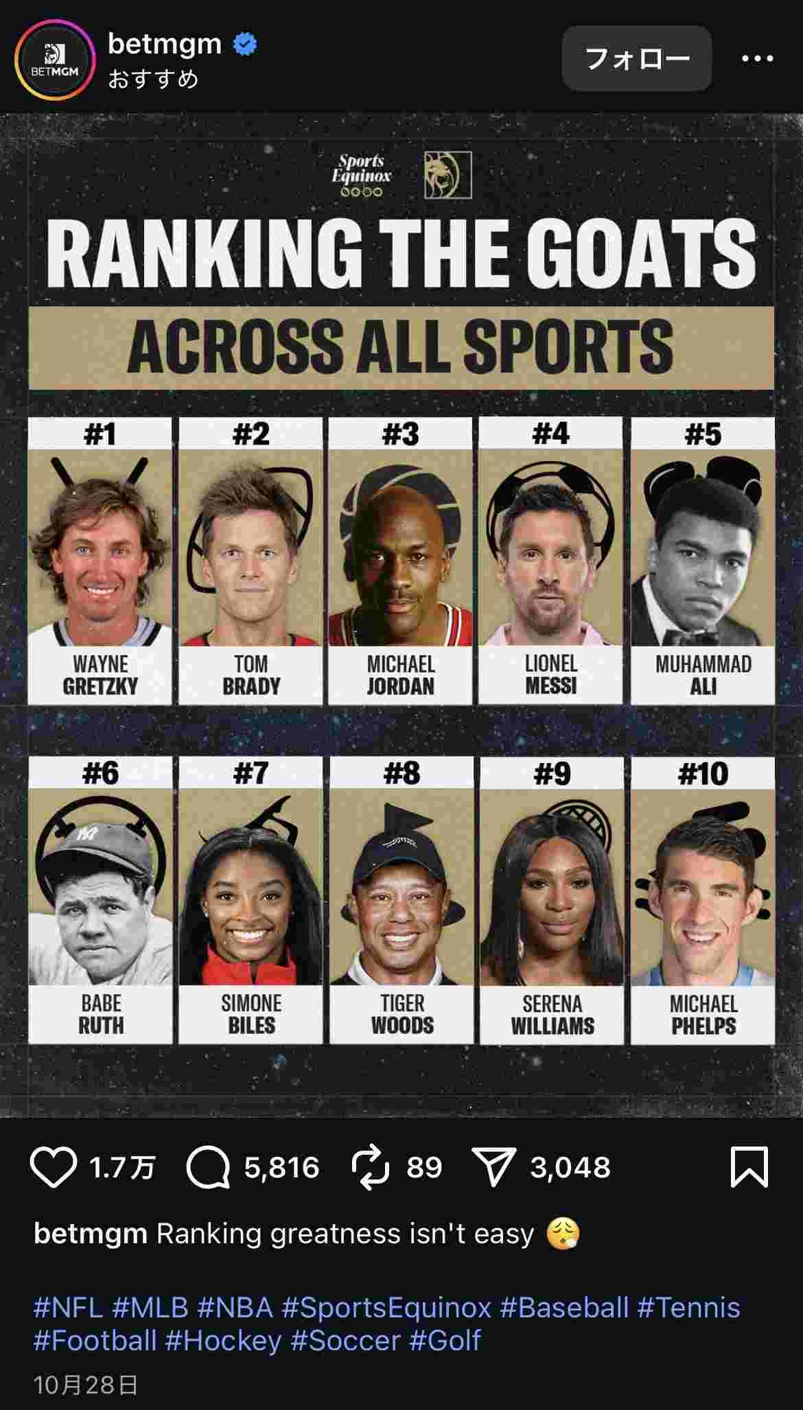 アメリカ人「スポーツ選手のGOATランキング作ったぞ!!」w w w w w w w w w w w w w w w