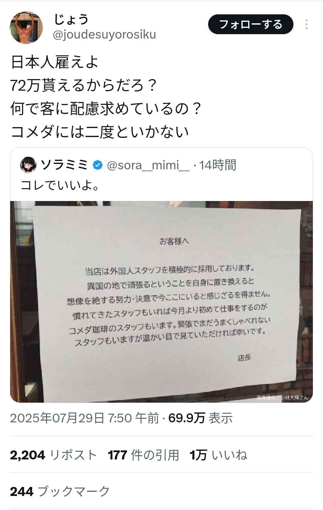 コメダ珈琲「異国の地で働こうとするって凄くね?積極的に外国人雇用するわ。温かい目で見守ってほしい」ネトウヨブチギレ不買運動へ