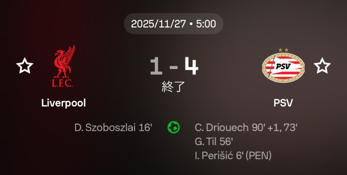 いや首位はPSVやしプレミア王者のリバプールをフルボッコにしたけど? - 55 : 2025/12/06(土) 10:20:21.303 ID:ZPCh9sl4K