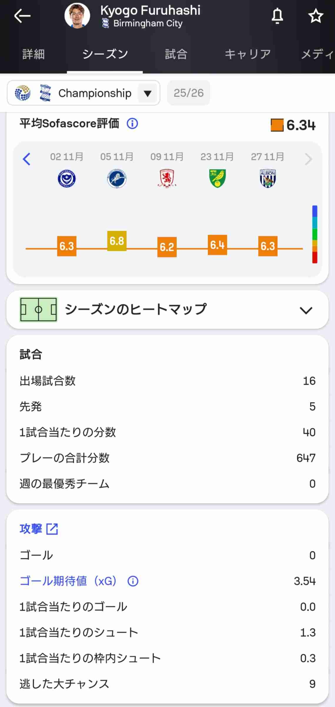 16試合 0ゴール 9ビッグチャンスでのミス