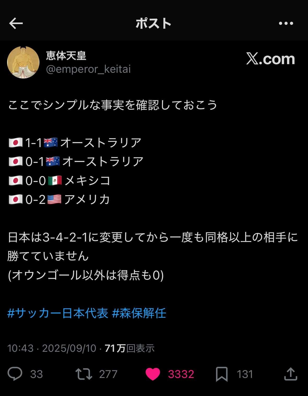 なんならここから0-5で5連敗くらいして森保解任されるのが1番成功ルートや