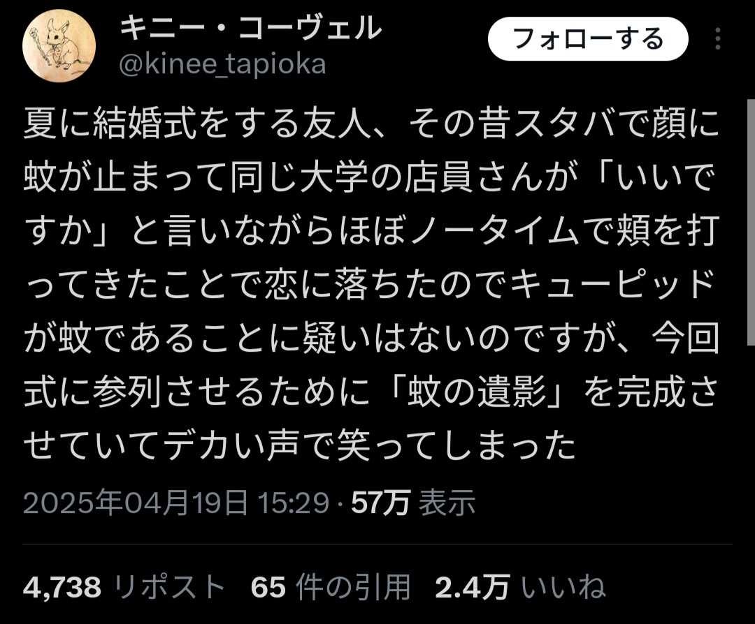 例えばこのポストに蚊の遺影が添付してあったらエピソード全てが嘘でも面白いと思う
