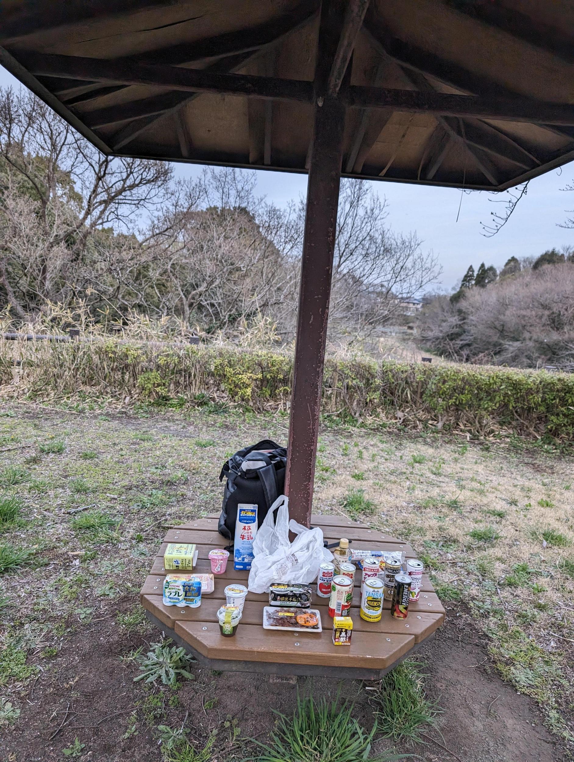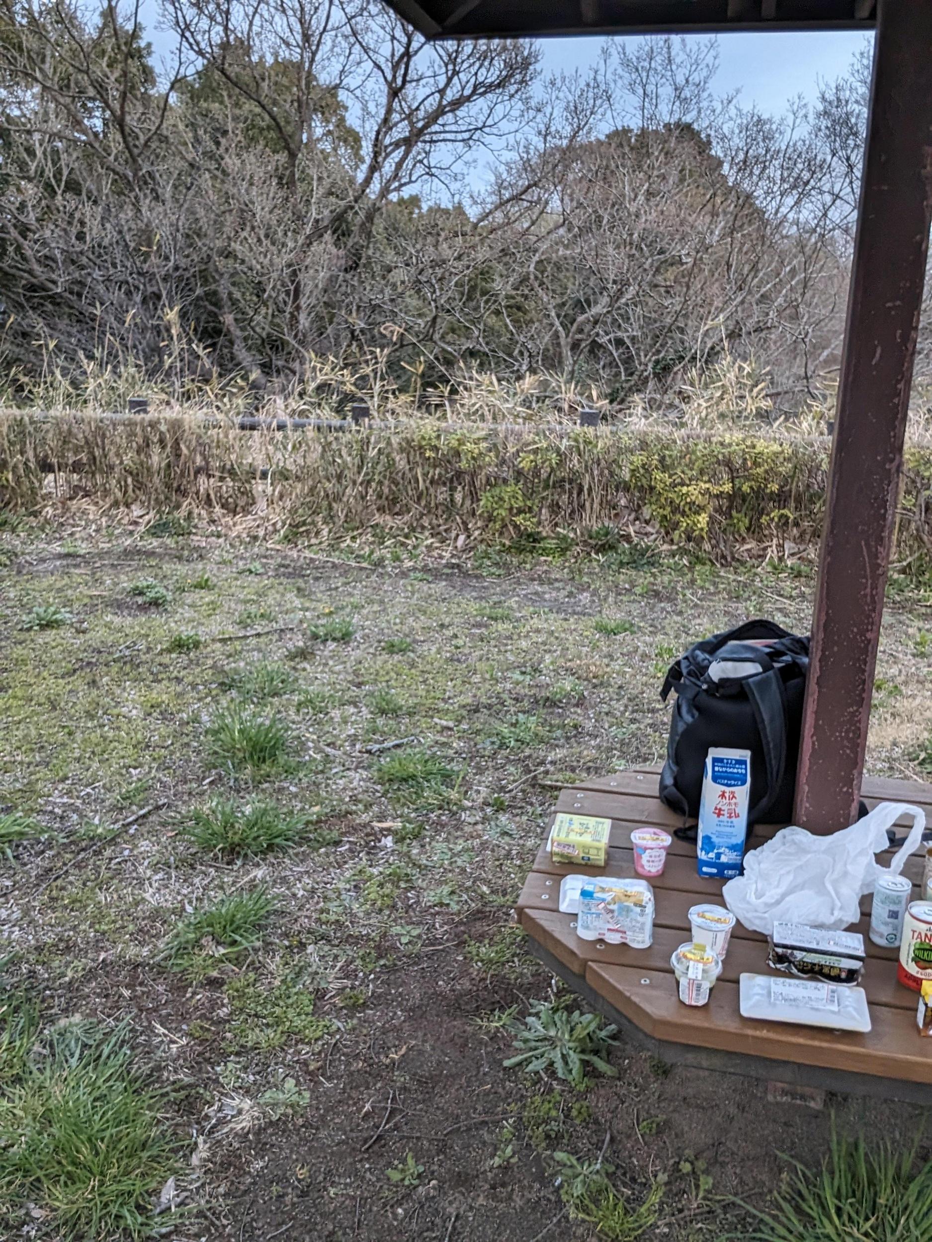 木々が枯れてて寒そうな東屋だな