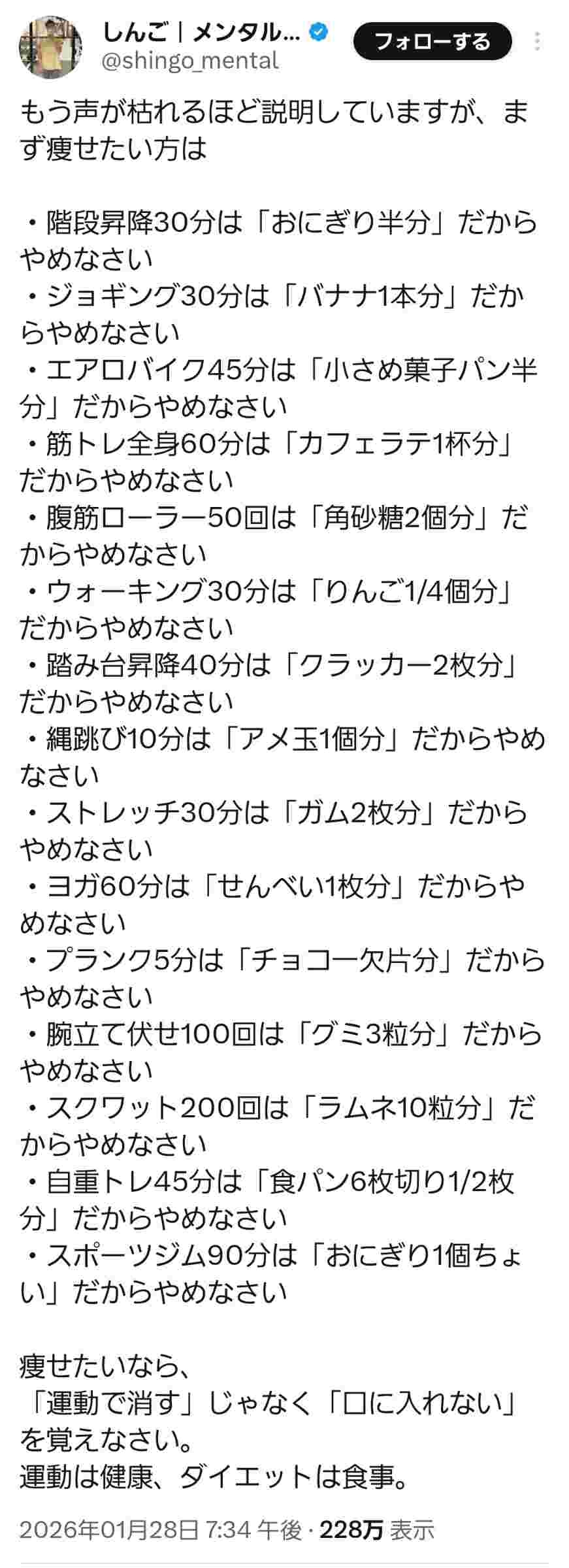 ダイエットのために運動はいらんけど健康のためには必要っていうのが最新の研究やろ