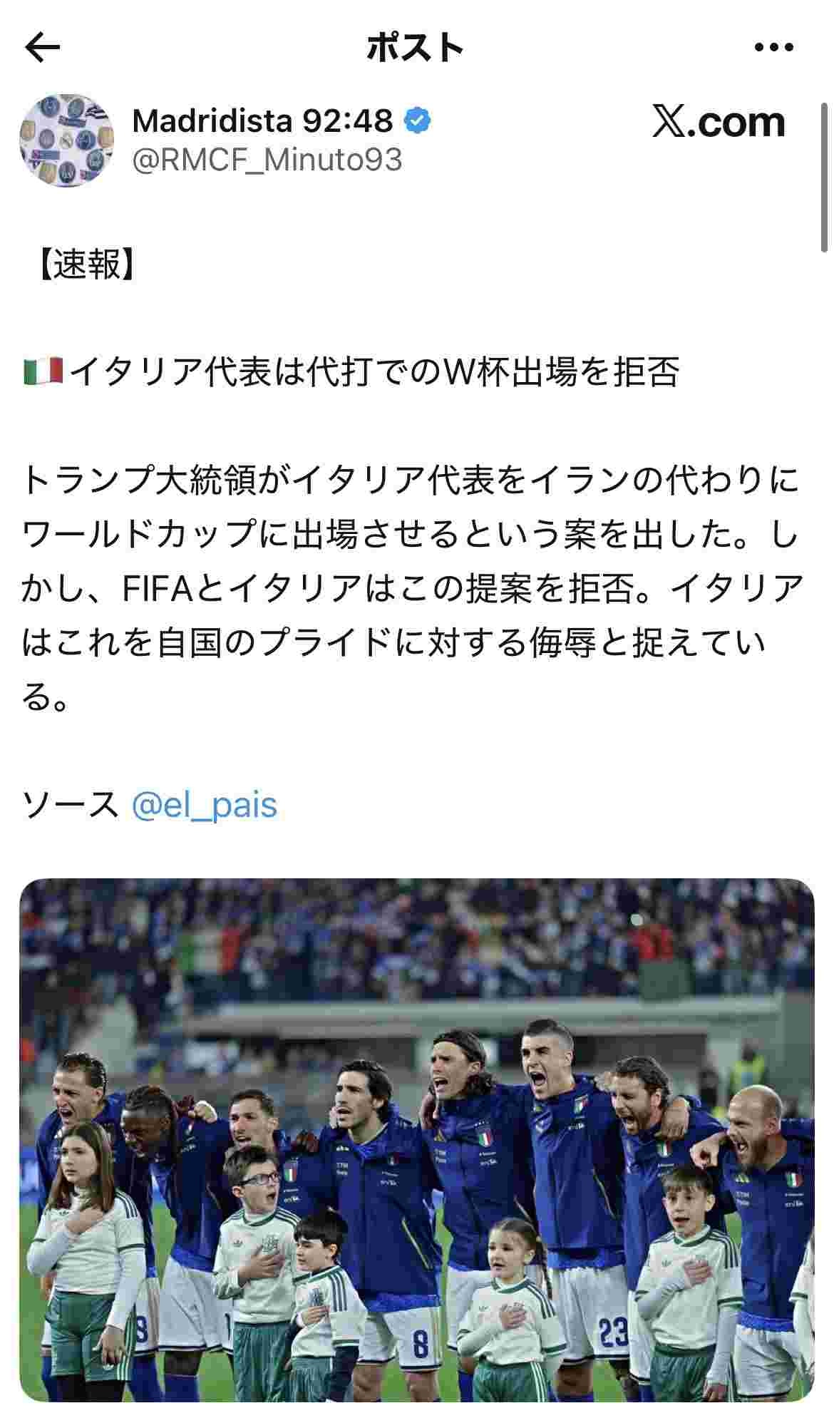 トランプ「イランの代わりにイタリアがw杯出れば?」イタリア代表「拒否する」
