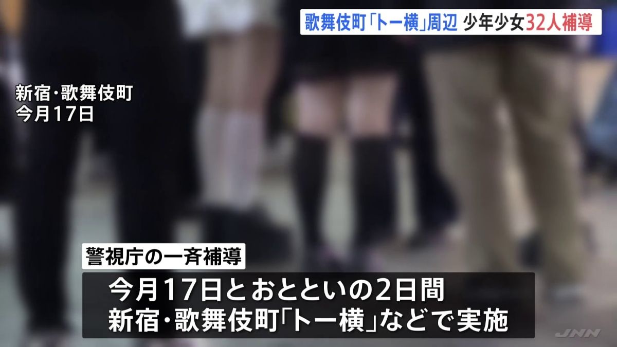 - 警視庁によりますと、一斉補導は今月17日とおとといの2日間、新宿区歌舞伎町の「トー横」などで実施されました。14歳の大阪府の中学生など少年少女32人が、保護者の同意を得ずに深夜に外出したなどとして、補導されたということです。