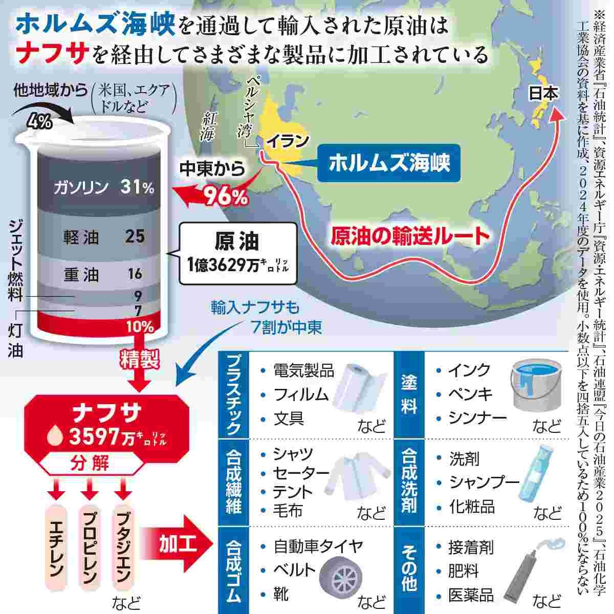 https://www.sankei.com/article/20260418-MZGKSSRWANNLZC3NIMAMPVKKTE/中東依存の原油、96%が中東から輸入 プラ、ゴム、繊維、塗料… あらゆる場所に影響