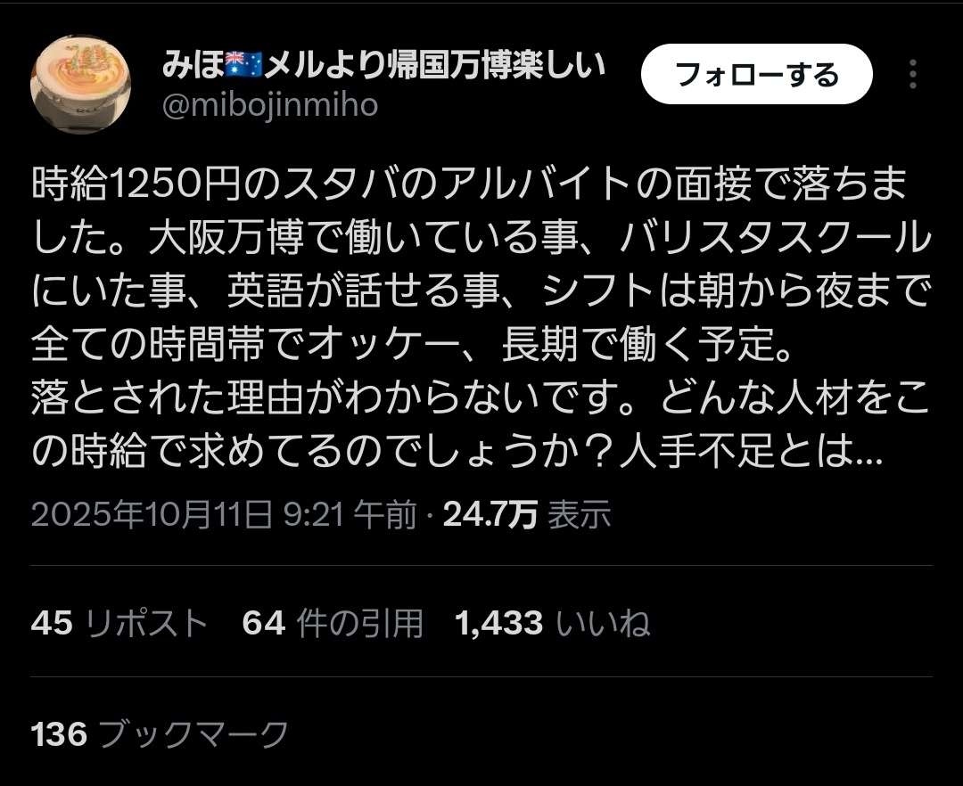 ハイスペ女子さん、何故か時給1250円のスタバのバイトに落ちてしまう