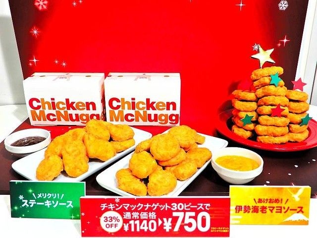マクドナルドのチキンマックナゲットが期間限定で30%オフになる。15ピース売りに限り、通常価格税込570円のところ390円で販売される。2018年11月21日から2019年1月8日までの予定となっている。また、同じく11月21日から2019年1月上旬まで、「メリクリ!ステーキソース」「あけおめ!伊勢海老マヨソース」の2種類のソースもレギュラーの「バーベキュー」「マスタード」に加えて追加される。